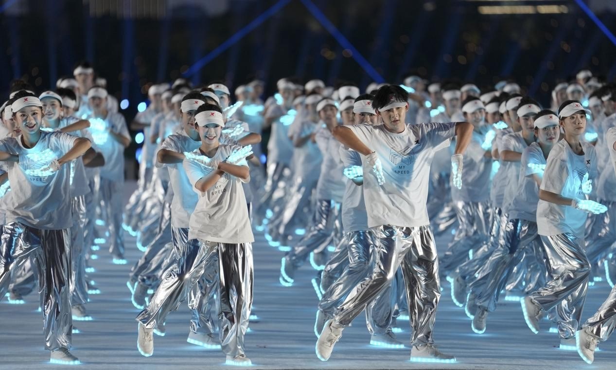 開幕式在《繽紛之約》表演中拉開序幕,街舞與輪滑、滑板、啦啦操等運動元素碰撞出青春火花激情開場。倒計時焰火組成的篆體“成都”字樣,將傳統(tǒng)文化與現(xiàn)代科技巧妙結(jié)合。來自全球的運動員在吉祥物“蜀寶”“錦仔”的歡迎下入場,手持融入蜀繡、漆藝等非遺工藝的引導(dǎo)牌,踏上榮耀之路。