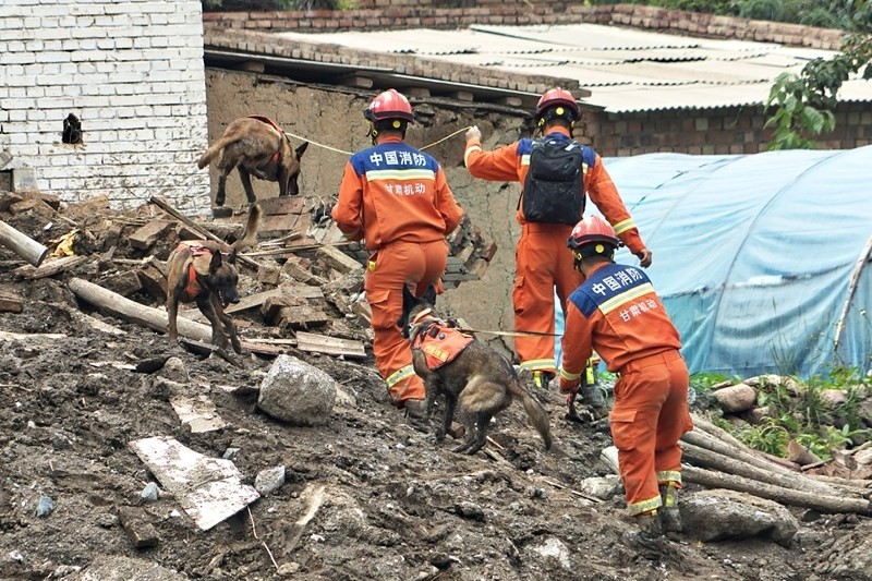 8月9日,國(guó)家西北區(qū)域應(yīng)急救援中心指戰(zhàn)員在馬坡鄉(xiāng)舊莊溝村攜帶搜救犬配合大型機(jī)械搜救失聯(lián)人員。