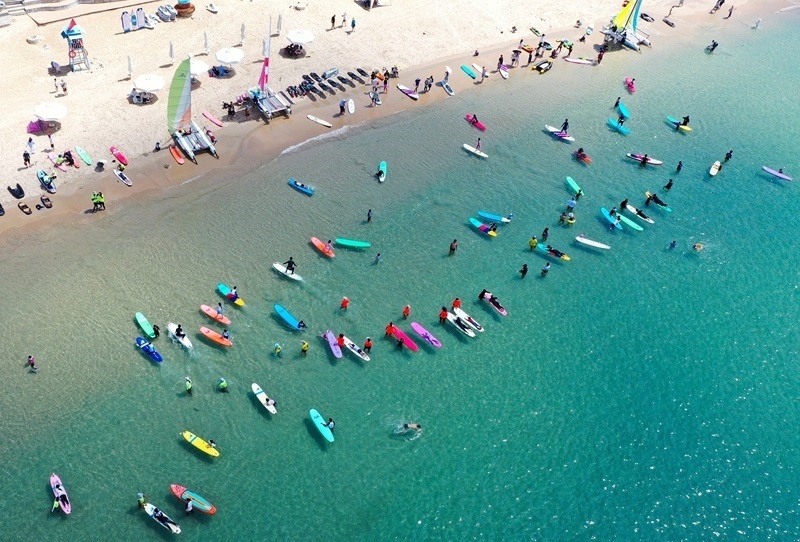 8月10日,游客在三亞市后海村附近海域沖浪嬉水(無人機照片)。