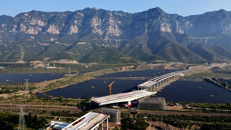 這是8月11日拍攝的河南省濟(jì)源市沿太行山高速公路跨焦柳鐵路立交橋轉(zhuǎn)體施工現(xiàn)場(無人機照片)。