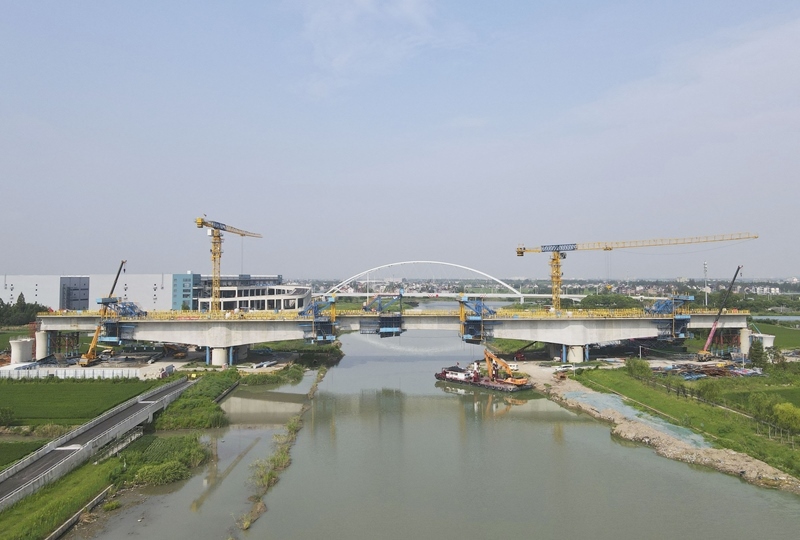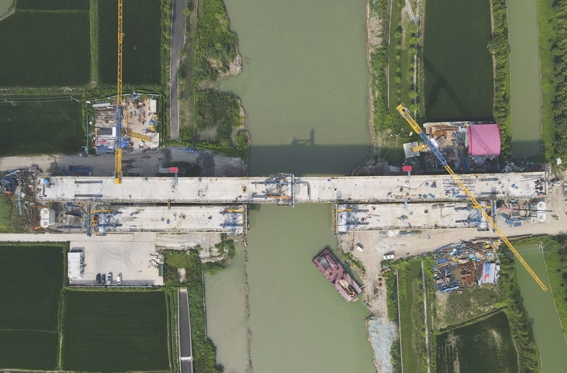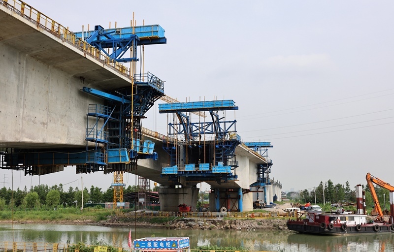8月12日拍攝的滬寧合高鐵上海特大橋跨羅蘊(yùn)河連續(xù)梁施工現(xiàn)場(chǎng)(無人機(jī)照片)。