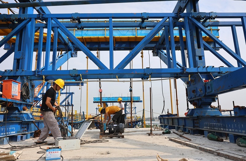 8月12日,工人在滬寧合高鐵上海特大橋跨羅蘊(yùn)河連續(xù)梁澆筑作業(yè)面施工。