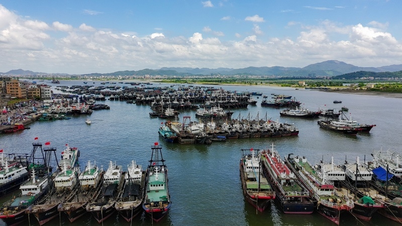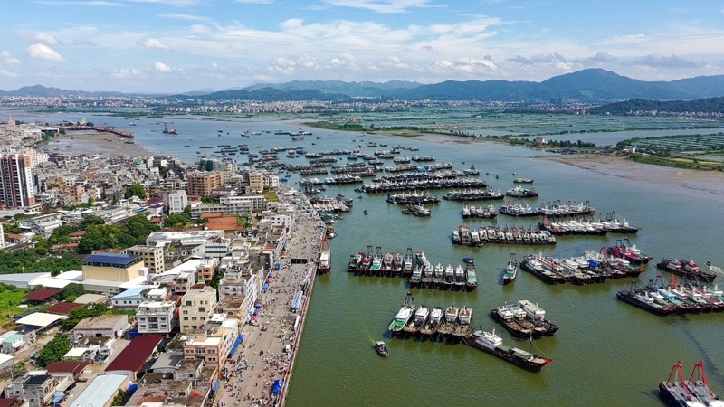8月16日,停泊在博賀漁港的漁船等待開漁(無人機(jī)照片)。