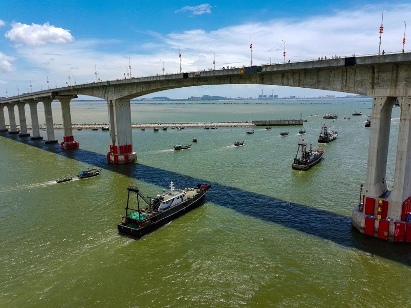 8月16日,出港的漁船駛過博賀灣大橋(無人機(jī)照片)。