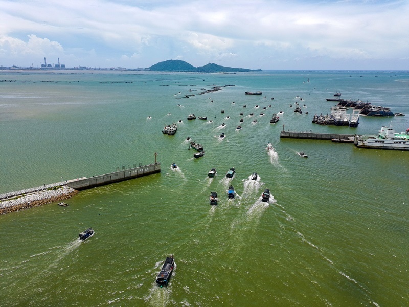8月16日,漁船駛出博賀漁港開始捕撈作業(yè)(無人機(jī)照片)。