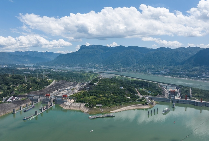 8月16日,在湖北省宜昌市,船舶有序通過(guò)三峽雙線五級(jí)船閘和三峽升船機(jī)(無(wú)人機(jī)照片)。