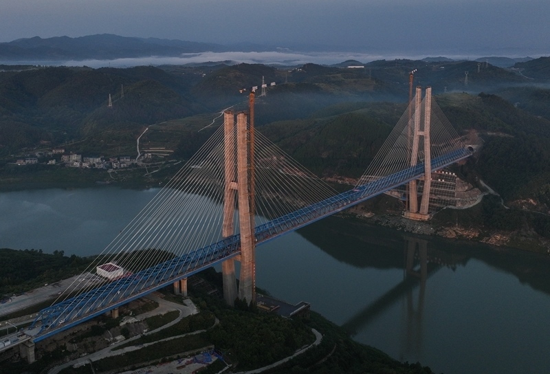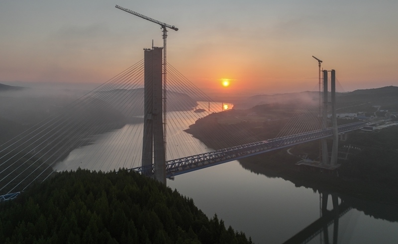 8月18日,由中鐵十一局承建的西安至十堰高速鐵路(簡稱“西十高鐵”)漢江特大橋鋼桁梁順利合龍。漢江特大橋位于湖北省十堰市,跨越丹江口水庫庫區(qū),是西十高鐵全線控制性工程,全長917.45米,主跨420米。本次合龍的鋼桁梁全長840米、寬11米、高9.4米,采用漸變?nèi)氰焓浇Y(jié)構(gòu),最重桁節(jié)36.4噸。