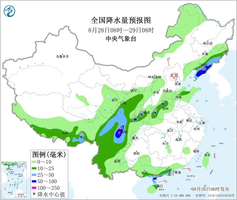 8月28日08時(shí)至29日08時(shí),吉林東部、遼寧中東部、甘肅南部、寧夏、陜西、山東北部、河南北部和西部、四川盆地西部、川西高原、云南西部、西藏南部、廣東西南部、廣西南部、海南島等地的部分地區(qū)有中到大雨,其中,遼寧東部和南部、陜西南部、四川盆地西部、廣東西南部等地的部分地區(qū)有暴雨,局地大暴雨(100~140毫米)。內(nèi)蒙古中東部、遼東半島、山東半島等地的部分地區(qū)有4~6級風(fēng)。渤海有6~7級、陣風(fēng)8級的東北風(fēng),黃海北部海域有5~7級、陣風(fēng)8級的偏南風(fēng),南海東北部海域有5~7級、陣風(fēng)8級的偏東風(fēng)。