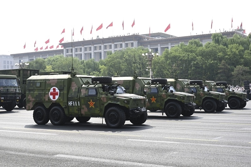 9月3日,紀念中國人民抗日戰(zhàn)爭暨世界反法西斯戰(zhàn)爭勝利80周年大會在北京隆重舉行。這是后勤保障方隊接受檢閱。