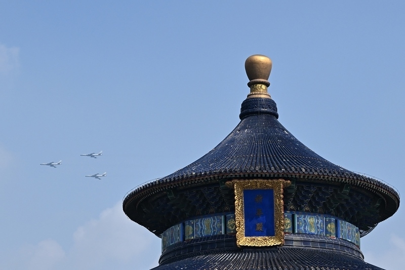 9月3日,紀(jì)念中國(guó)人民抗日戰(zhàn)爭(zhēng)暨世界反法西斯戰(zhàn)爭(zhēng)勝利80周年大會(huì)在北京隆重舉行。這是在北京天壇公園拍攝的轟炸機(jī)梯隊(duì)。