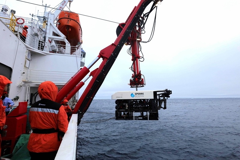 8月7日,科考隊(duì)員將ROV(無(wú)人遙控潛水器)放入水中。