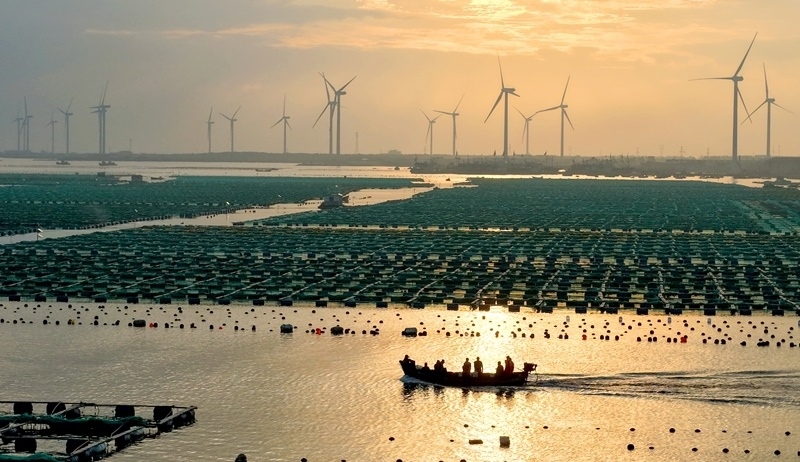 10月4日,在山東省榮成市石島管理區(qū)桑溝灣海洋牧場,漁民出海從事養(yǎng)殖生產(chǎn)。