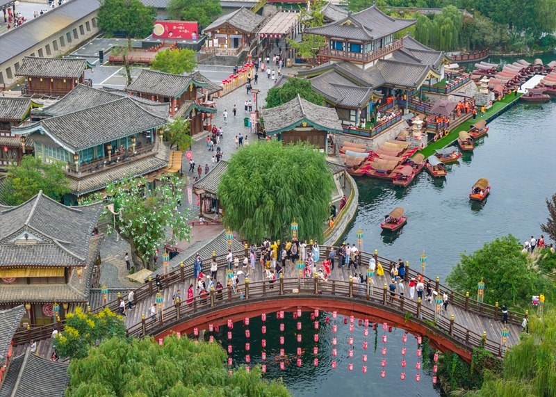 10月5日,游客在湖北省襄陽(yáng)市唐城景區(qū)游玩(無(wú)人機(jī)照片)。