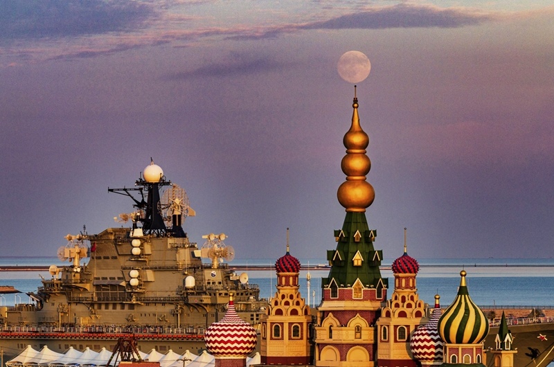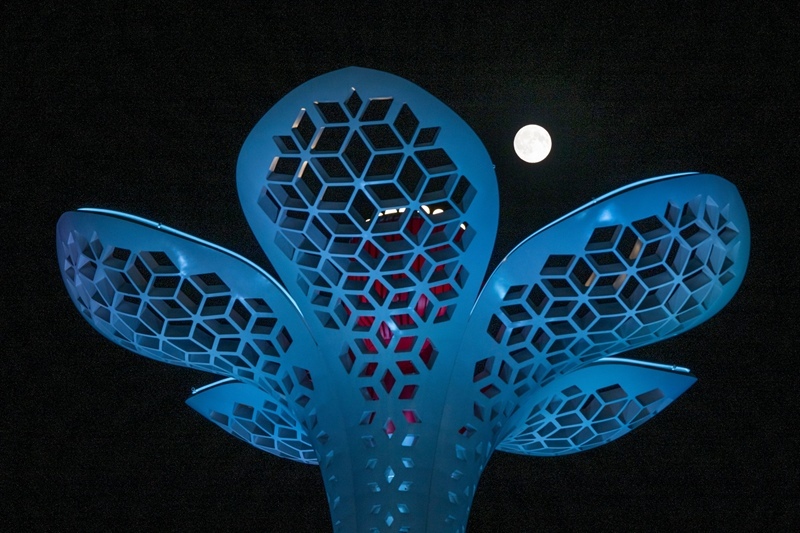 10月6日在天津市濱海新區(qū)泰達航母主題公園拍攝的中秋滿月(無人機照片)。