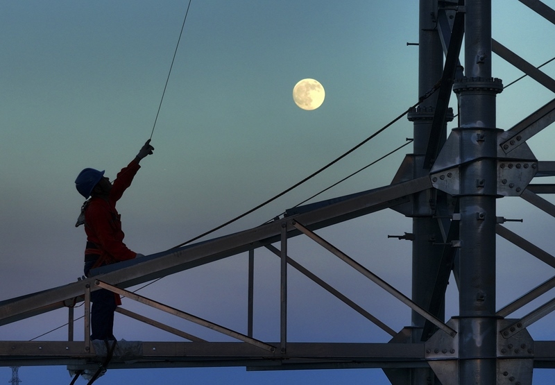 10月6日,在湖南省衡陽市雁峰區(qū),高塔架線工人在月光的映射下施工(無人機照片)。