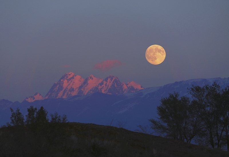 10月6日在新疆烏魯木齊拍攝的天山山脈上空的中秋圓月。