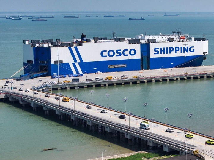 2025年9月16日,在江蘇太倉港,裝載3600余輛商品車的“玉衡先鋒”號即將啟程前往東南亞(無人機(jī)照片)。新華社記者 李博 攝