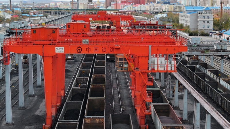 10月18日,在中國鐵路哈爾濱局集團(tuán)有限公司滿洲里站,機(jī)械化換裝場在對進(jìn)口貨物進(jìn)行換裝作業(yè)(無人機(jī)照片)。