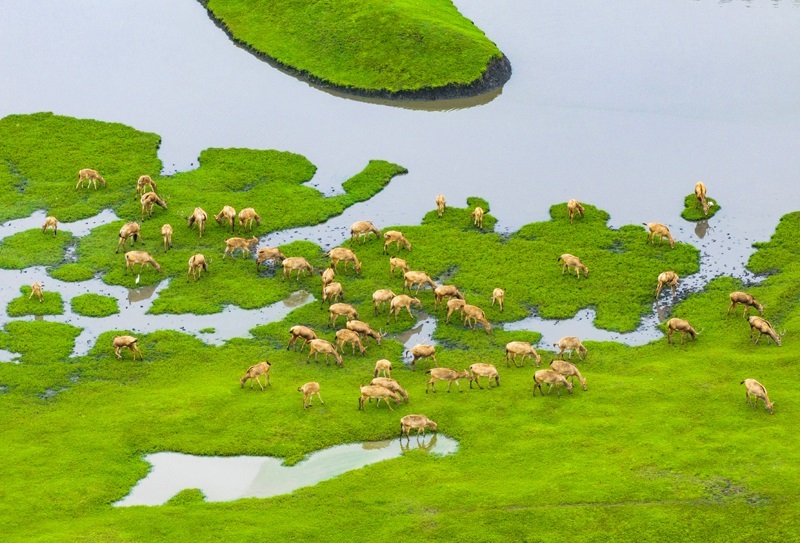 10月17日,在江蘇省泰州市姜堰區(qū)溱湖國家濕地公園,一群麋鹿在棲息、覓食(無人機照片)。