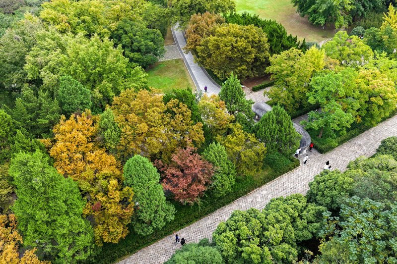 10月17日,游人在南京明孝陵景區(qū)石象路賞景游玩(無人機照片)。
