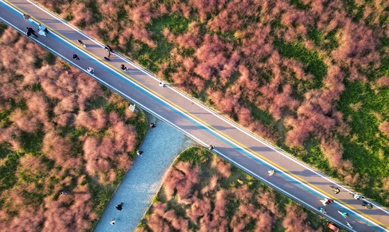 10月18日,游客在山東省東營市東營區(qū)耿井濕地粉黛亂子草“花?!迸恼沾蚩ǎo人機照片)。
