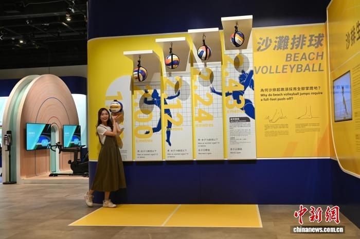 10月23日,香港科學館舉辦“國家發(fā)展成就系列──臻至完美:運動與科學的交匯”展覽,展示全國運動會的歷史及第十五屆全國運動會香港賽區(qū)的賽事項目。圖為一名女士體驗沙灘排球項目,了解運動員的跳躍高度。 中新網(wǎng)記者 李志華 攝