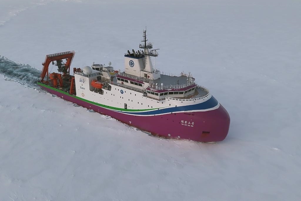 “探索三號”在北極密集冰區(qū)破冰航行。(自然資源部供圖)