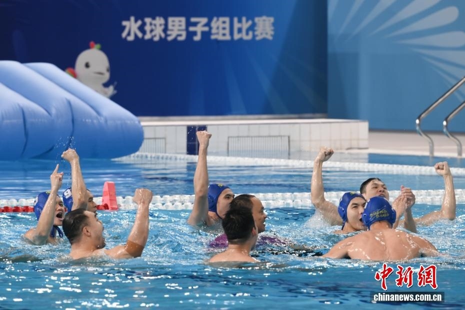 10月27日晚,在廣東廣州舉行的第十五屆全國運(yùn)動(dòng)會(huì)水球男子組比賽金牌賽中,廣東隊(duì)以16比9戰(zhàn)勝上海隊(duì),獲得金牌。圖為廣東隊(duì)?wèi)c祝比賽獲勝。