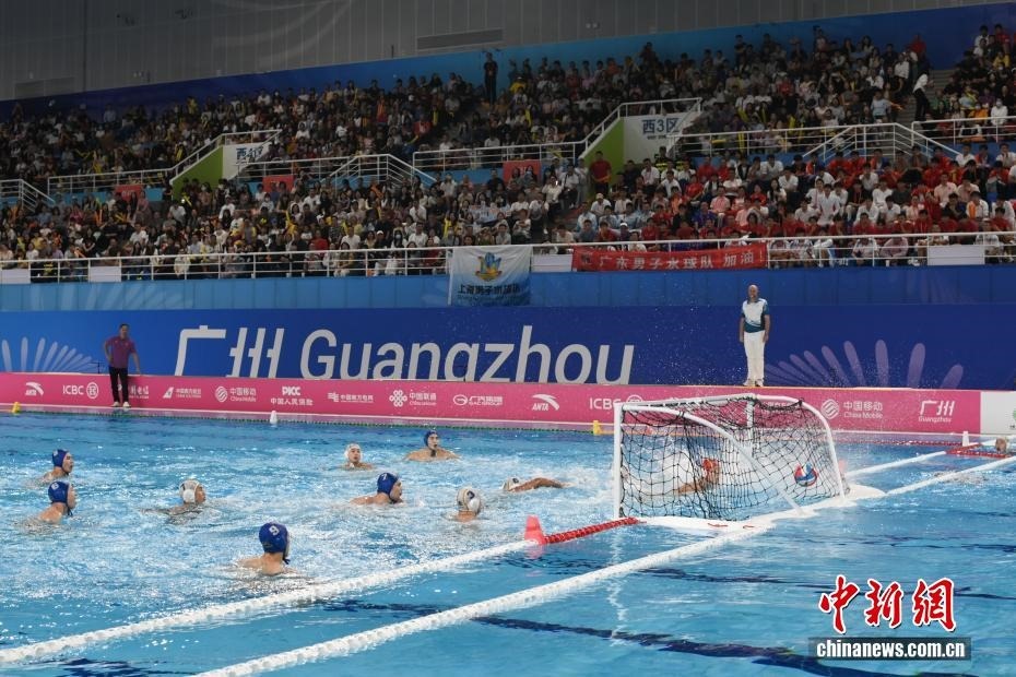 10月27日晚,在廣東廣州舉行的第十五屆全國運(yùn)動(dòng)會(huì)水球男子組比賽金牌賽中,廣東隊(duì)(藍(lán)帽)以16比9戰(zhàn)勝上海隊(duì)(白帽),獲得金牌。圖為廣東隊(duì)進(jìn)球得分。