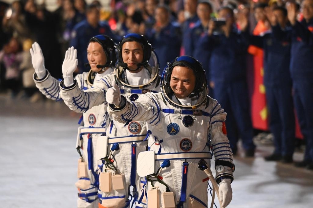 神舟二十一號(hào)航天員張陸、武飛、張洪章領(lǐng)命出征。