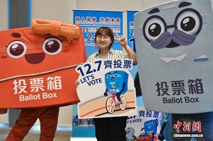 10月23日,香港特區(qū)政府和選舉管理委員會(huì)舉行2025年立法會(huì)換屆選舉啟動(dòng)禮,為第八屆立法會(huì)選舉揭開序幕。圖為一名女士與“票箱家族”角色合影?!≈行律缬浾?李志華 攝
