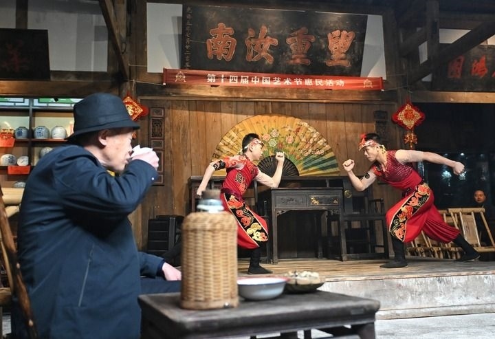 2025年10月25日,茶客在成都金琴老茶館一邊喝茶一邊觀看沈陽雜技演藝集團(tuán)雜技演員表演的雜技節(jié)目《男子對手》,這是第十四屆中國藝術(shù)節(jié)惠民活動之一。新華社記者 劉坤 攝