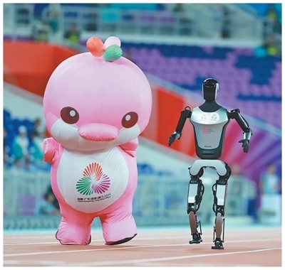 十五運(yùn)會(huì)賽場,吉祥物與機(jī)器人互動(dòng)。本報(bào)記者 陶相安攝