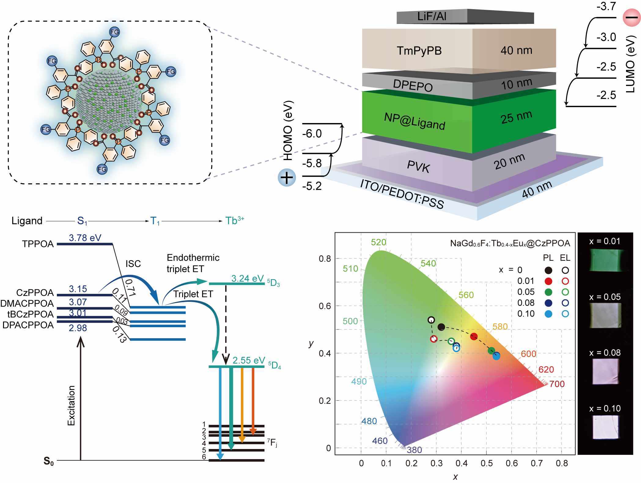 面對這一制約稀土材料邁向高端應(yīng)用的瓶頸,研究團(tuán)隊開創(chuàng)性地提出有機(jī)半導(dǎo)體敏化策略,以功能化有機(jī)配體作為“光電橋梁”,成功將能量精準(zhǔn)高效地傳遞給絕緣稀土納米晶,實現(xiàn)了電流驅(qū)動下的高效發(fā)光。