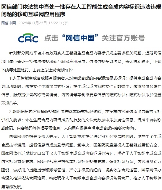 針對部分網(wǎng)站平臺未有效落實人工智能生成合成內(nèi)容標(biāo)識規(guī)定要求相關(guān)問題,近期網(wǎng)信部門集中查處一批違法違規(guī)移動互聯(lián)網(wǎng)應(yīng)用程序,依法依規(guī)予以約談、責(zé)令限期改正、下架下線等處置處罰。主要違法違規(guī)情形如下: