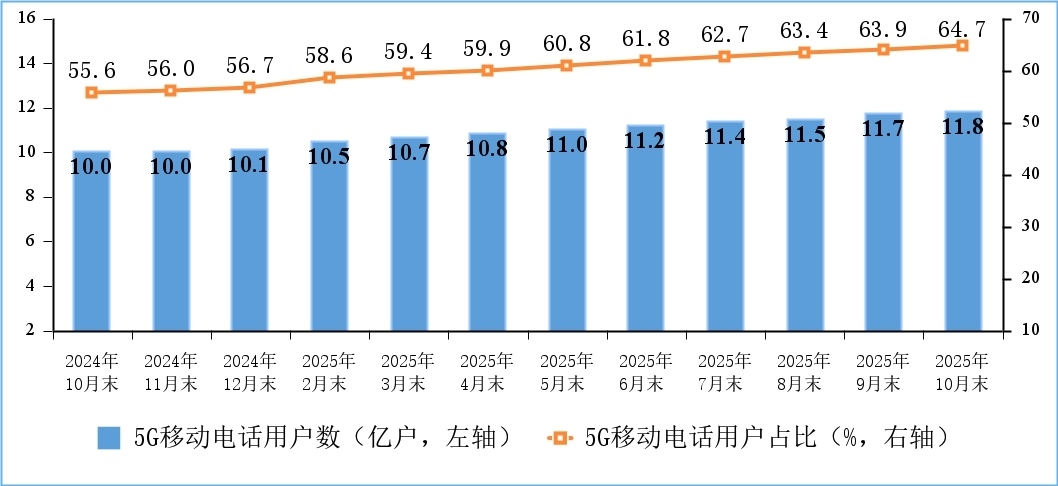 移動電話用戶規(guī)模穩(wěn)中有增,5G用戶數(shù)持續(xù)增加。截至10月末,三家基礎(chǔ)電信企業(yè)及中國廣電的移動電話用戶總數(shù)達18.3億戶,比上年末凈增4015萬戶。其中,5G移動電話用戶達11.84億戶,比上年末凈增1.7億戶,占移動電話用戶的64.7%。