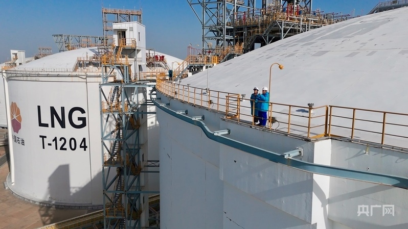 記者和采訪對象站在20萬立方米的LNG儲罐上(央廣網(wǎng)記者 楊夢奎 攝)