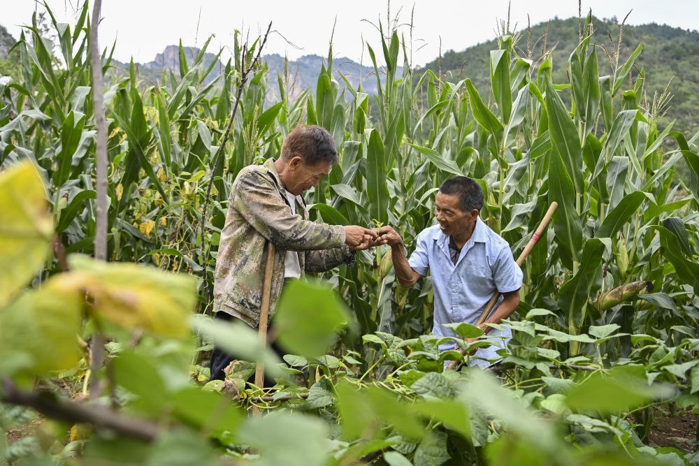↑村民桑建平(左)通過(guò)手勢(shì)告訴秦海松野草和蔬菜的區(qū)別(2025年8月27日攝)。