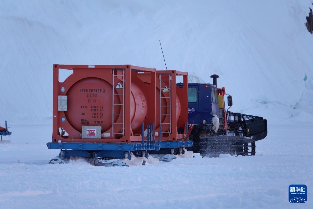 北京時間12月3日凌晨,雪地車?yán)訚M燃油的油罐離開“雪龍2”號,駛向中山站。新華社記者 顧天成 攝