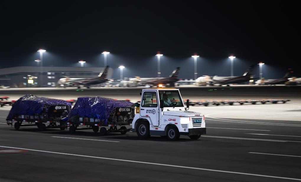 子夜時分,記者驅(qū)車來到這座機(jī)場時,撲面而來的是一派“不夜空港”的繁忙景象:雪亮的停機(jī)坪上,貨機(jī)剛一停穩(wěn),工作人員便操控牽引車、加油車、轉(zhuǎn)運(yùn)車簇?fù)矶?,卸貨、加油、檢查,井井有條,一刻也不耽誤。