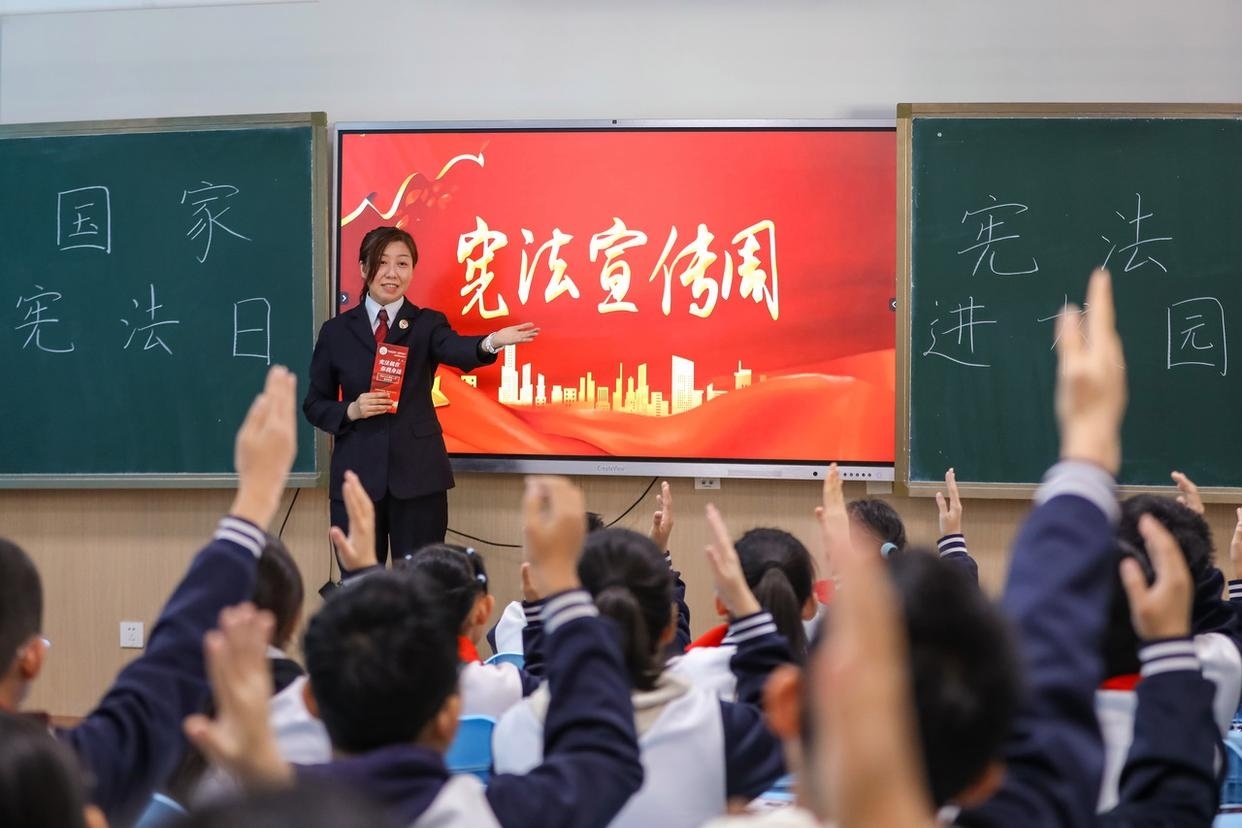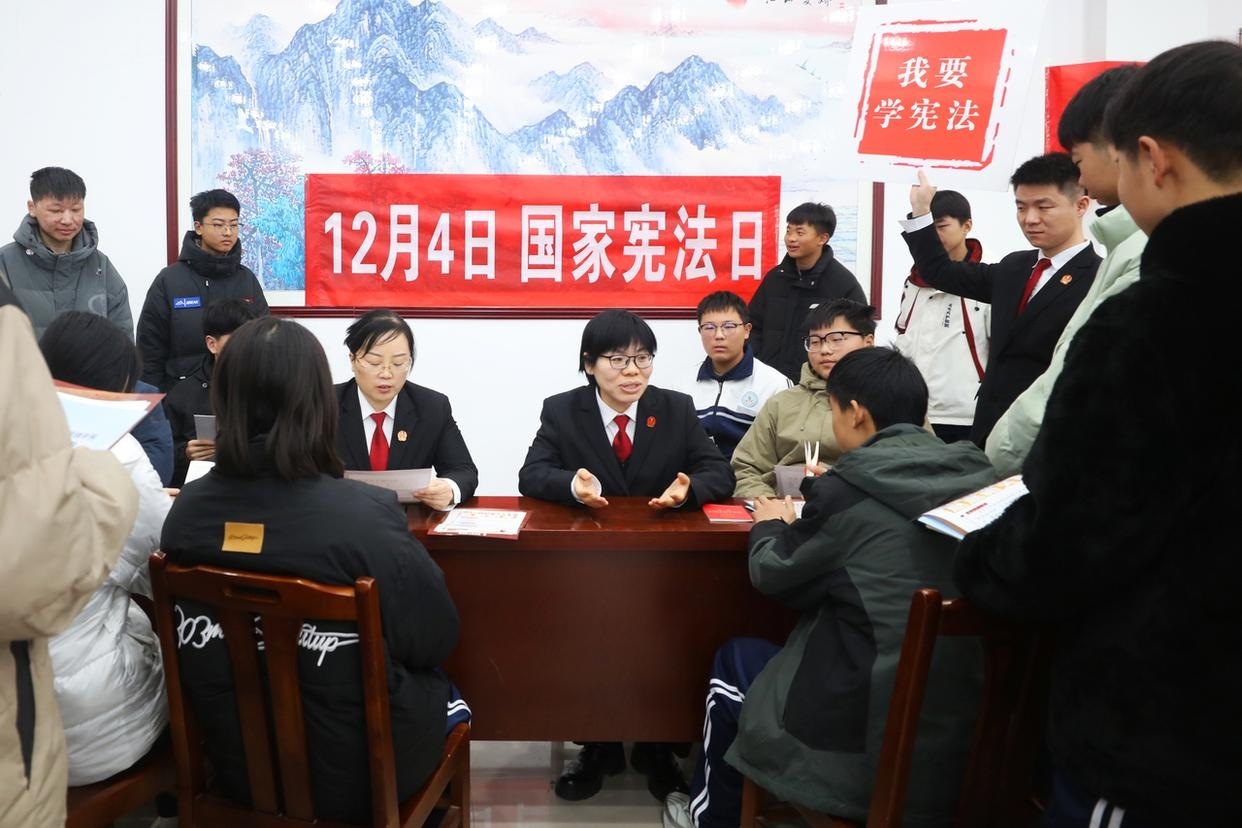 12月3日,山東省棗莊市市中區(qū)人民法院組織法官走進(jìn)校園,開展主題宣傳活動(dòng),向?qū)W生普及憲法知識(shí)、宣傳法治觀念、弘揚(yáng)憲法精神。(工人日報(bào)通訊員 孫中喆 攝)