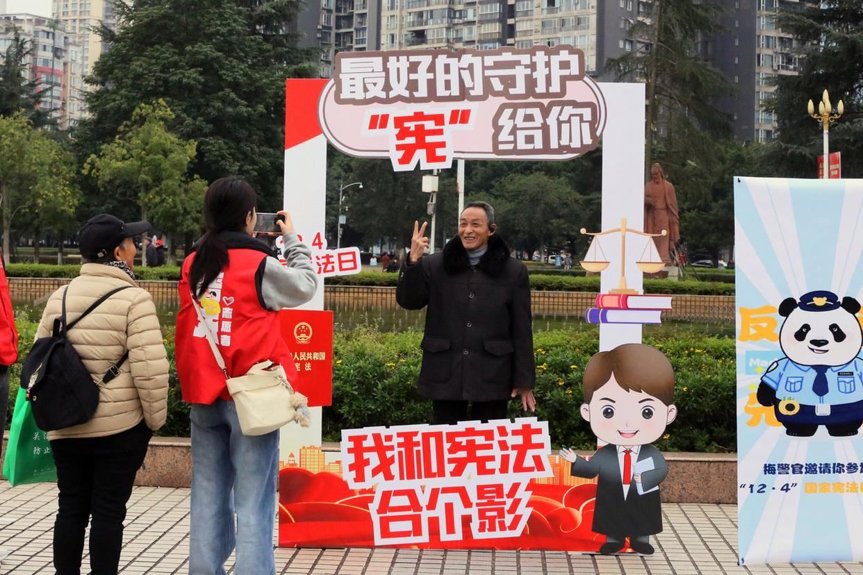 12月4日,四川省樂山市市中區(qū)司法局普法宣傳志愿者在樂山新廣場開展“憲法宣傳日”活動(dòng),市民在法治打卡框合影留念。(工人日報(bào)通訊員 李華時(shí) 攝)