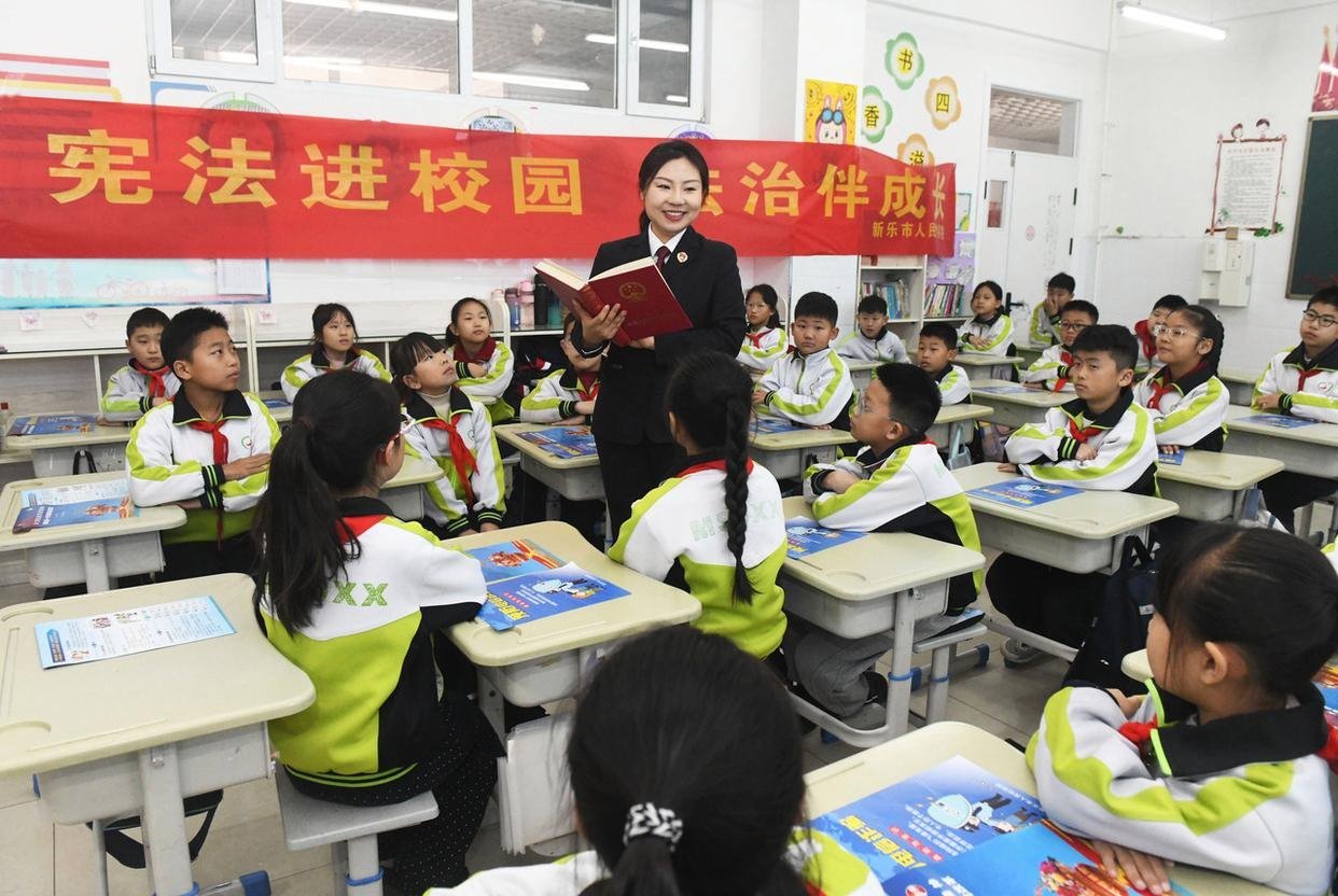 12月4日,在河北省石家莊市欒城區(qū)凌空橋路小學(xué),欒城區(qū)法院的工作人員為學(xué)生們普及憲法知識(shí)。(工人日報(bào)通訊員 李明發(fā) 攝)