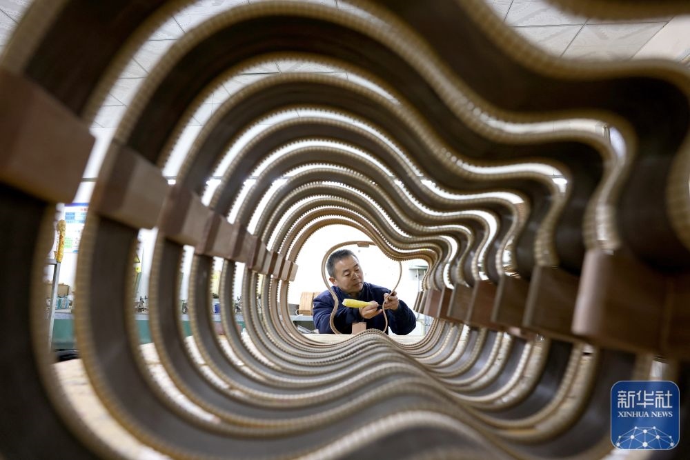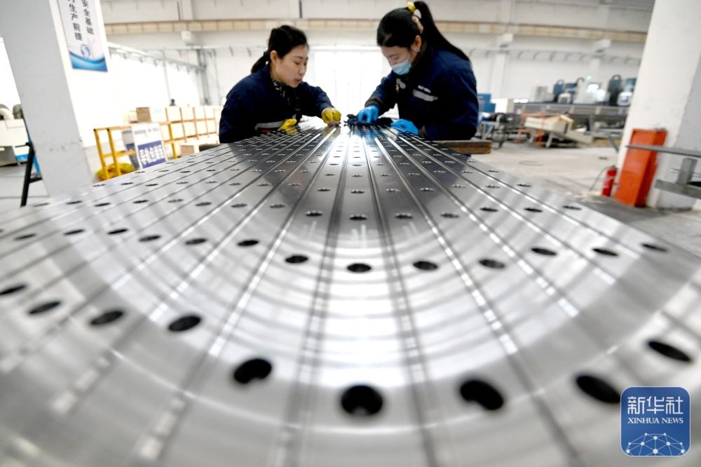 ↑ 12月15日,中鐵科工集團武漢江夏制造基地技術工人對盾構機配件進行裝配作業(yè)。新華社發(fā)(趙軍攝)