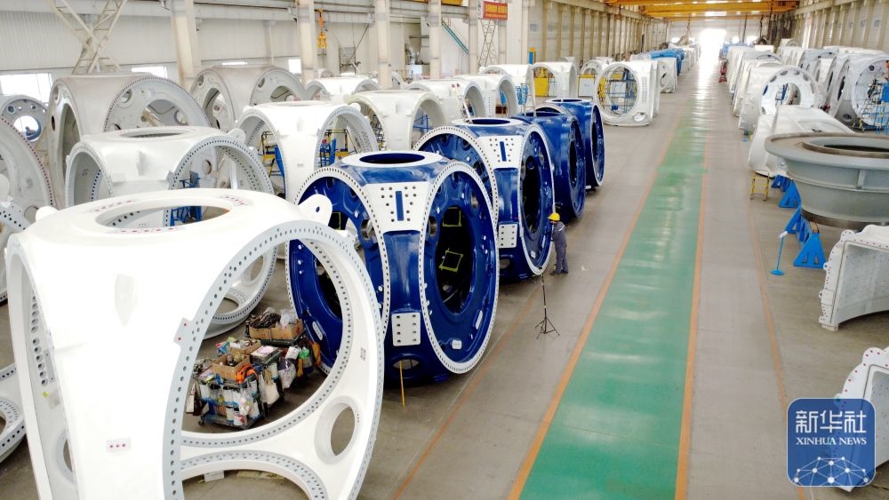 ↑ 12月15日,工人在山東省濱州市惠民經濟開發(fā)區(qū)風電裝備產業(yè)園的車間清理風電輪轂(無人機照片)。新華社發(fā)(王軍攝)