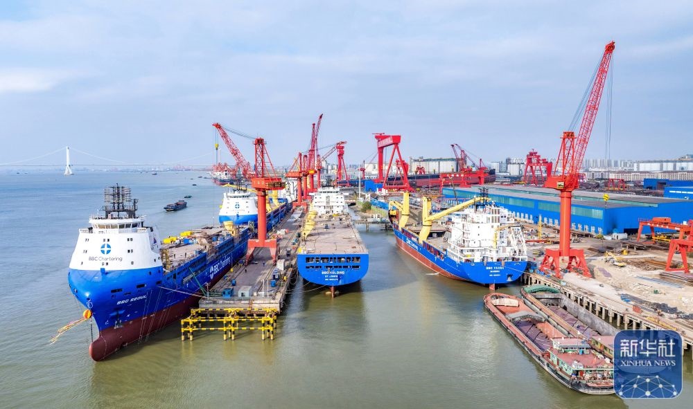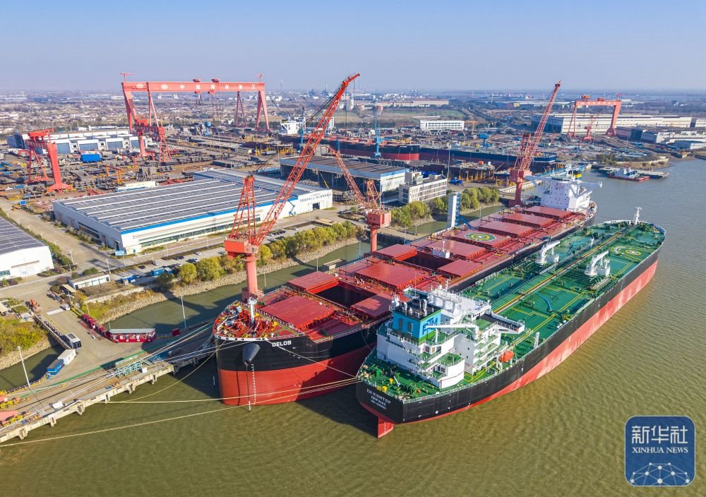 ↑ 這是12月14日拍攝的位于江蘇省江都經濟開發(fā)區(qū)的揚州中遠海運重工有限公司生產廠區(qū)(無人機照片)。新華社發(fā)(任飛攝)