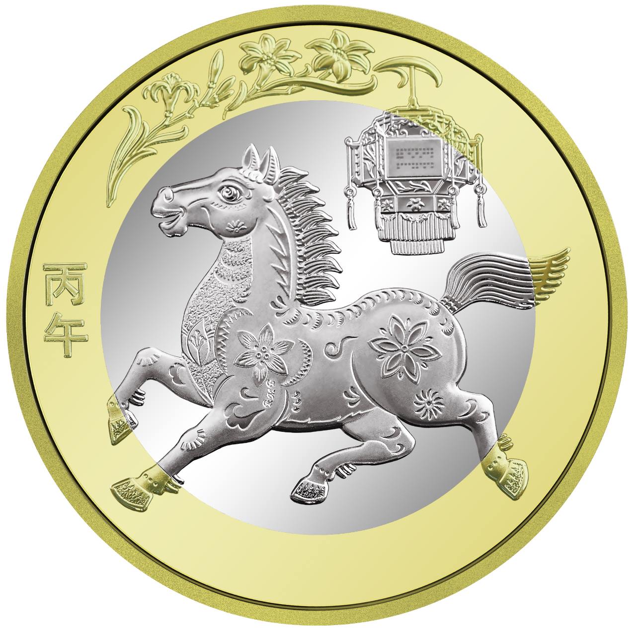 雙色銅合金紀(jì)念幣背面圖案為中國傳統(tǒng)剪紙藝術(shù)與裝飾年畫元素相結(jié)合的馬形象,襯以花燈和萱草圖案,幣面左側(cè)刊“丙午”字樣。