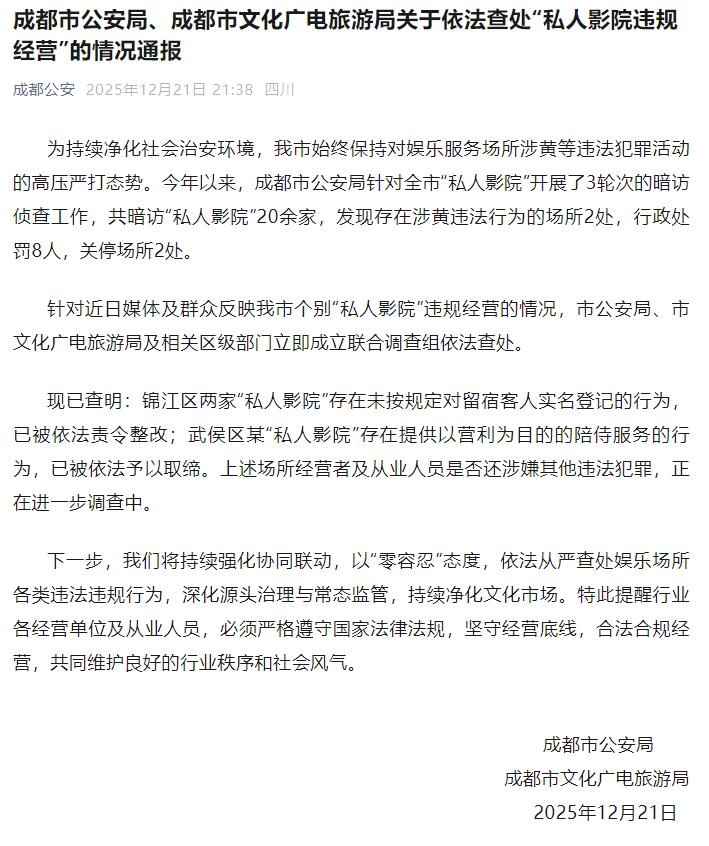 據(jù)“成都公安”微信公眾號(hào)消息,12月21日晚,成都市公安局、成都市文化廣電旅游局發(fā)布關(guān)于依法查處“私人影院違規(guī)經(jīng)營”的情況通報(bào):今年以來,成都市公安局針對(duì)全市“私人影院”開展了3輪次的暗訪偵查工作,共暗訪“私人影院”20余家,發(fā)現(xiàn)存在涉黃違法行為的場所2處,行政處罰8人,關(guān)停場所2處。