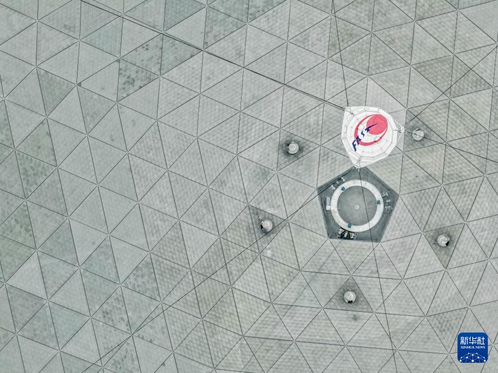 1月16日拍攝的“中國(guó)天眼”饋源艙(無(wú)人機(jī)照片,維護(hù)保養(yǎng)期間拍攝)。