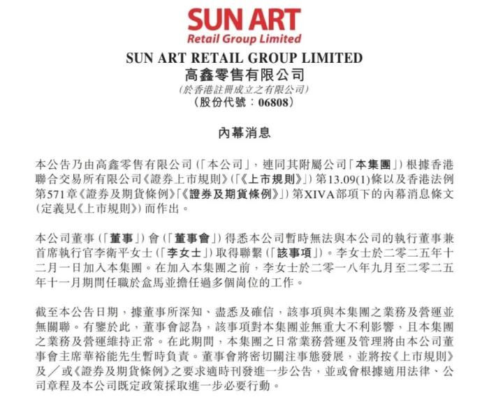 2月4日,大潤(rùn)發(fā)母公司高鑫零售在港交所發(fā)布公告稱,公司暫時(shí)無(wú)法與執(zhí)行董事兼首席執(zhí)行官李衛(wèi)平取得聯(lián)系。